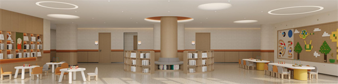 (3)兒童區:兒童活動區配備定制矮桌書架與活動墻,打造親子互動平臺;另外還設有小學自習室、兒童休息室及母嬰室,支持員工子女學習休息。