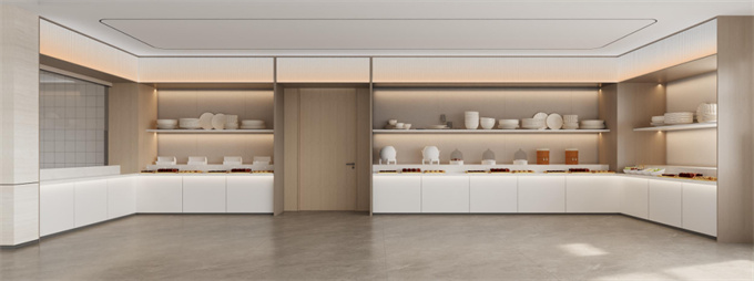 (3)餐廳:可同時容納80人,采用酒店早餐島臺式取餐動線,提高就餐效率。